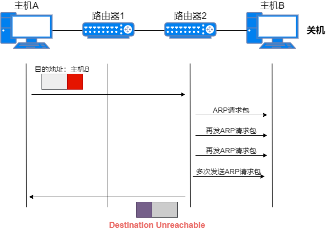 如果中间某个路由器没有到达目的网络的路由,便会向源设备回应一个 Destination Unreachable 消息,告知目的设备不可达。