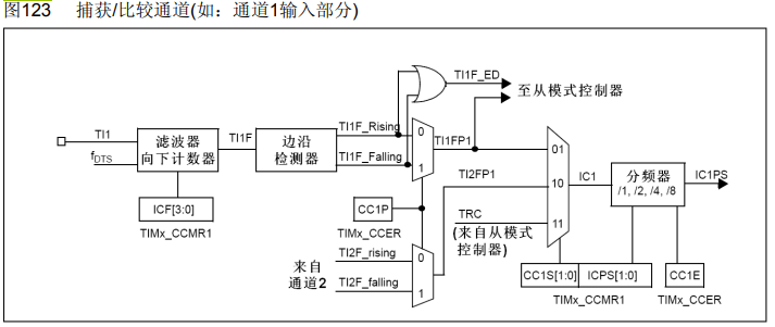 输入捕获通道1的详细框图如下所示:(如下是上面框图的一个细化结构,基本功能都是一样的)