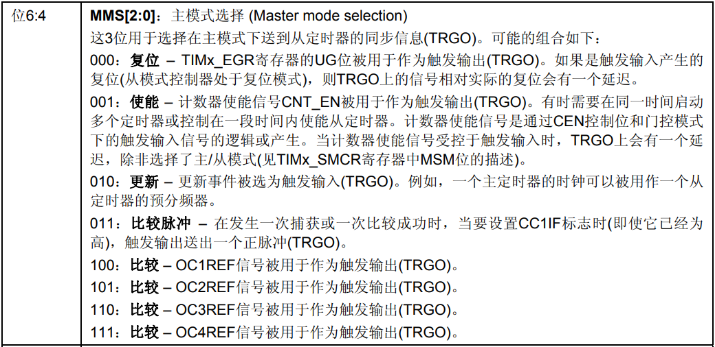 主模式可以将定时器内部的信号映射到TRGO引脚,用于触发其他外设的操作;