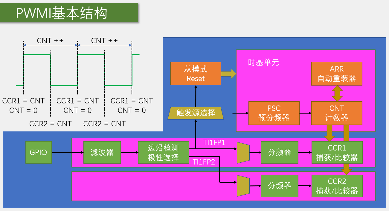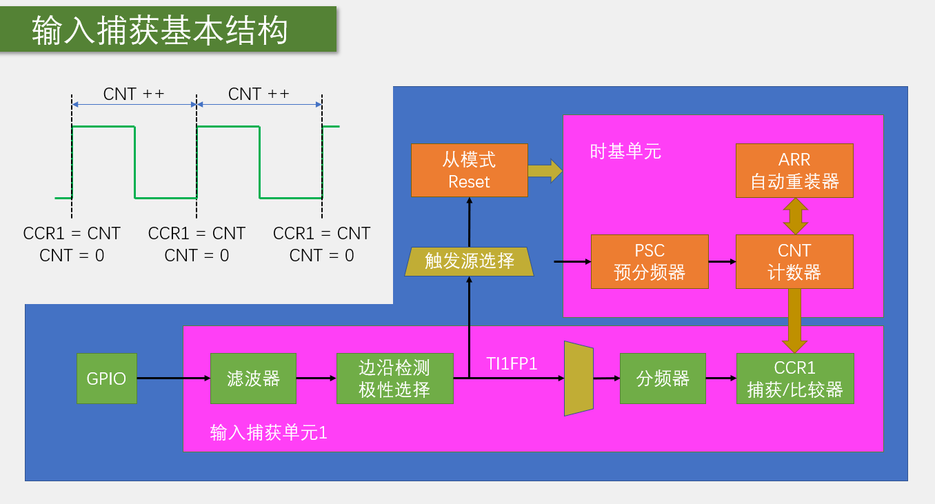 - TI1FP1信号和TI1F_ED边沿信号,都可以通向从模式控制器,比如TI1FP1信号的上升沿触发捕获,还可以同时触发从模式,这个从模式里就有电路,可以自动完成CNT的清零。从模式就是完成自动化操作的利器