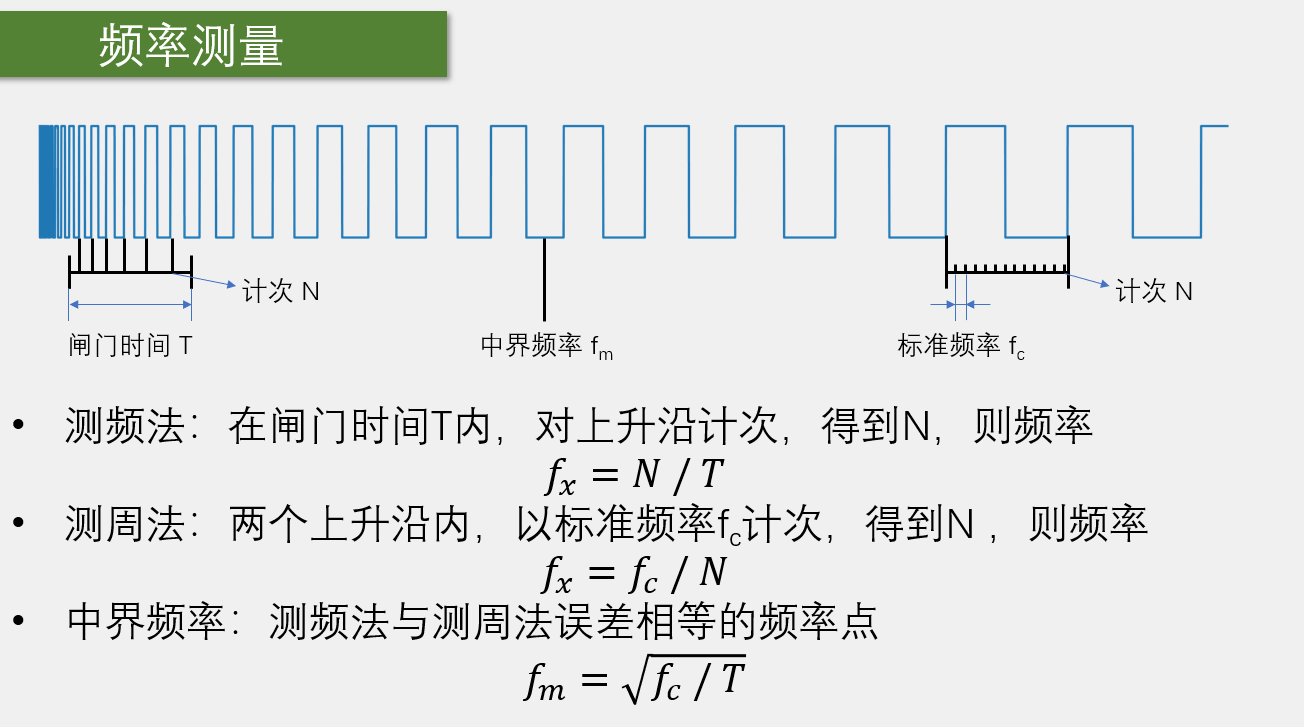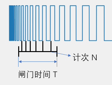 测频法的测试方法(直接按频率定义来进行测量的方法)是:在闸门时间T内,对上升沿(也可以是下降沿)计次,得到N,则待测信号频率𝑓𝑥 为: