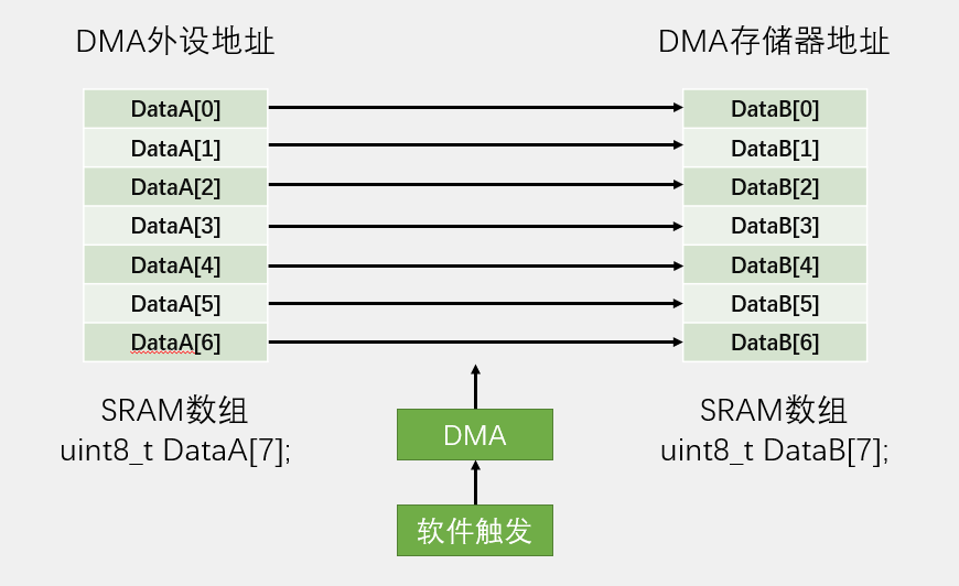 如果要进行存储器到存储器的数据转运,那我们就需要把其中一个存储器的地址放在外设的这个站点,这样就能进行存储器和存储器的转运了,只要你在外设起始地址里写Flash或者SRAM的地址,那他就会去Flash或SRAM找数据,这个站点虽然叫外设存储器,但是它就只是个名字而已,并不是说这个地址只能写寄存器的地址,如果写Flash的地址,那他就会去Flash里找,写SRAM,他就会去SRAM里找,这个没有限制,甚至你可以在外设站点写存储器的地址,存储器站点写外设的地址,然后方向参数给反过来,这样也是可以的,你也可以把它叫做站点a、站点b,从a到b或者从b到a转移数据,不必拘泥于他写的外设站点、存储器站点这个名字的。