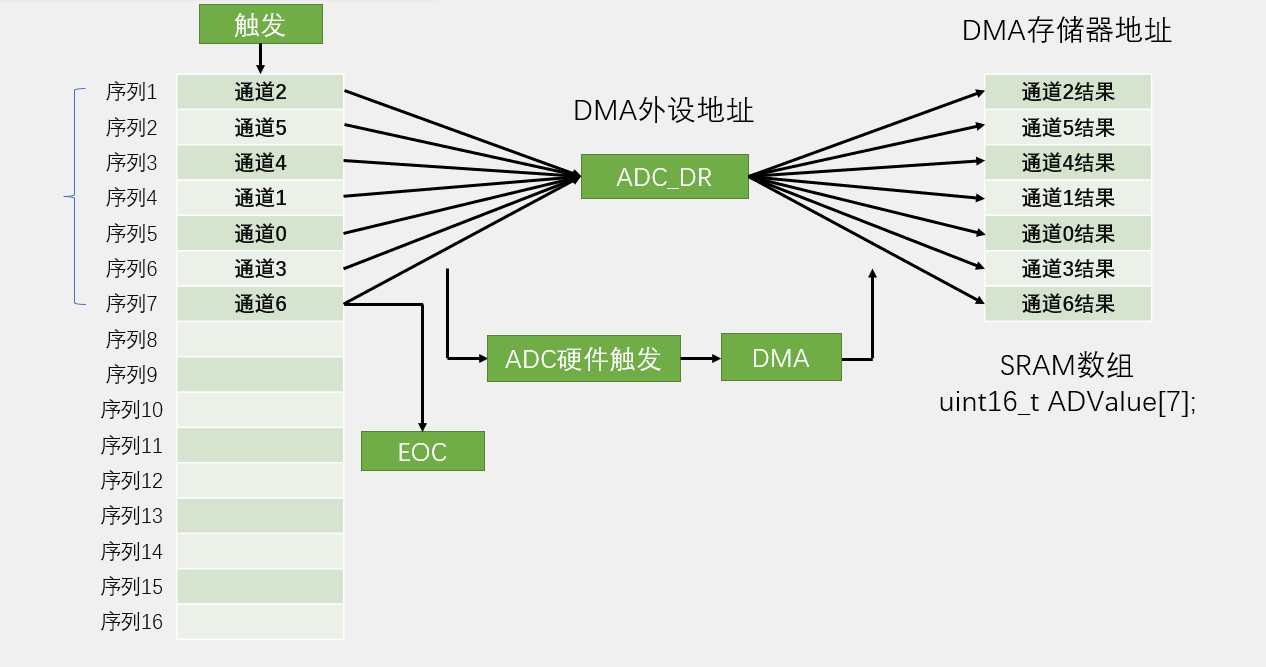 左边是ADC扫描模式的执行流程,在这里有七个通道触发一次后,七个通道依次进行AD转换 然后转换结果都放到ADC_DR数据寄存器里面,那我们要做的就是在每个单独的通道转换完成后,进行一次DMA数据转运,并且目的地址进行自增,这样数据就不会被覆盖了,所以在这里DMA的配置就是