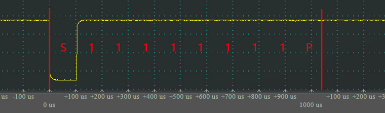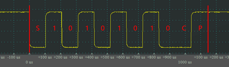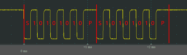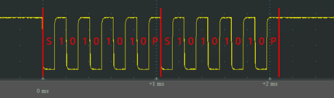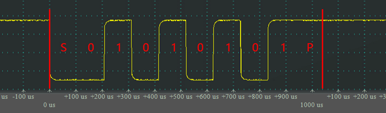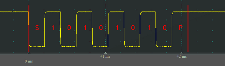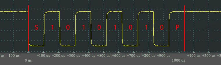 如果发送0xAA波形就是这样的,起始位,然后0101 0101,停止位,结束。